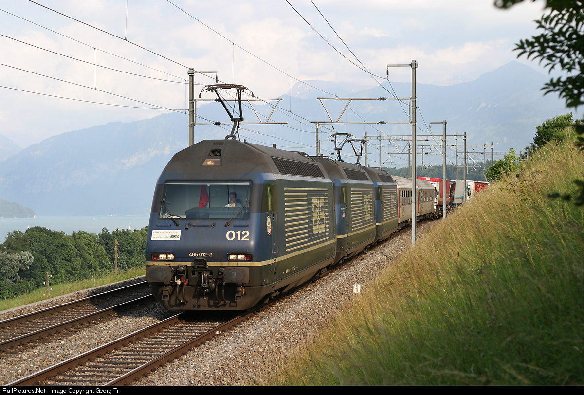 | Re 465 012 of the BLS, together with two sisters, is pulling a "Rolling Highway" train Novarra/Italy-Freiburg im Breisgau/Germany of RAlpin between Spiez and Gwatt along Lake Thun. The locomotive has a sticker for 1 year RAlpin service on the front. In the two passenger cars behind the locomotives, the drivers of the transported lorries can sleep or relax during the trip. |