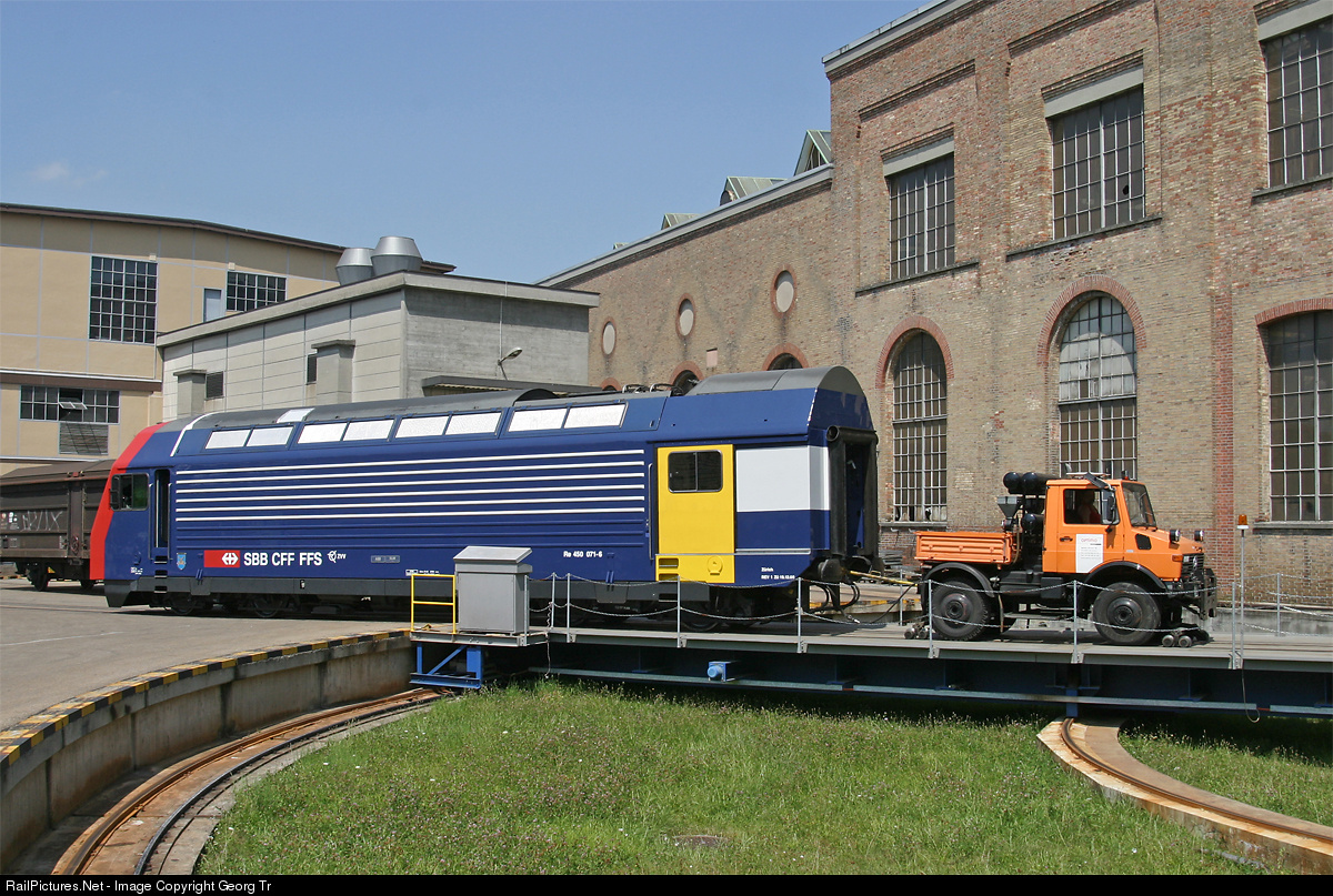 Street-rail "Unimog" shunter with locomotive Re 450 # 071 "Altenburg" of the SBB on the turntable of the Swiss Locomotive and Machine Works (SLM) in Winterthur. The locomotive was repared here after a damage.
