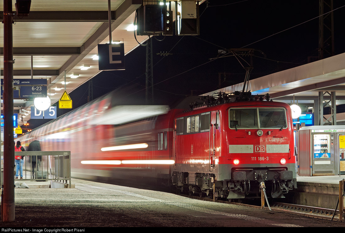 | The main railway station at Nürnberg is busy both day and night. A class 111 electric idles on track 6 with a Regional Bahn push-pull consist while another RB train bound for Treuchtlingen arrives on track 5. |