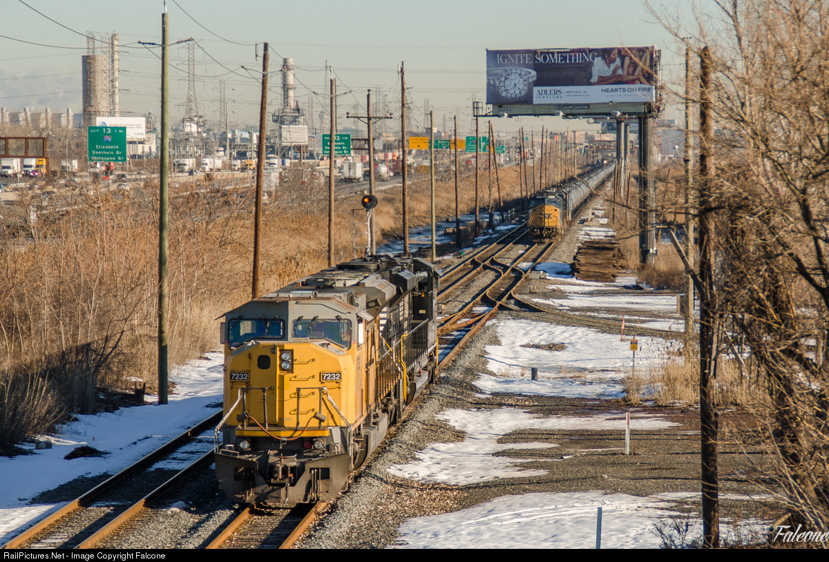 A pair of ethanol trains parked at Tremley Point on the Garden State Secondary. In the foreground is 64E with ex-UP 90mac and an ACe for power. Behind it is K636 with an ex-Conrail SD60I. The light in the distance is Bayway local BY-01. And to the left is the New Jersey Turnpike.