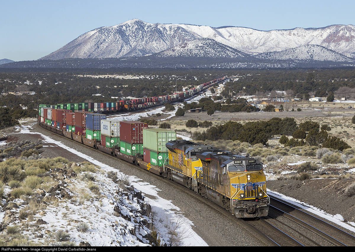 | For the last month or so, Union Pacific trains have been detouring over the BNSF Transcon due to track work on the UP tracks in Arizona. On a chilly February morning, an eastbound UP train races down the snowy Arizona Divide at Darling as a westbound BNSF train works hard up the grade in the background. |