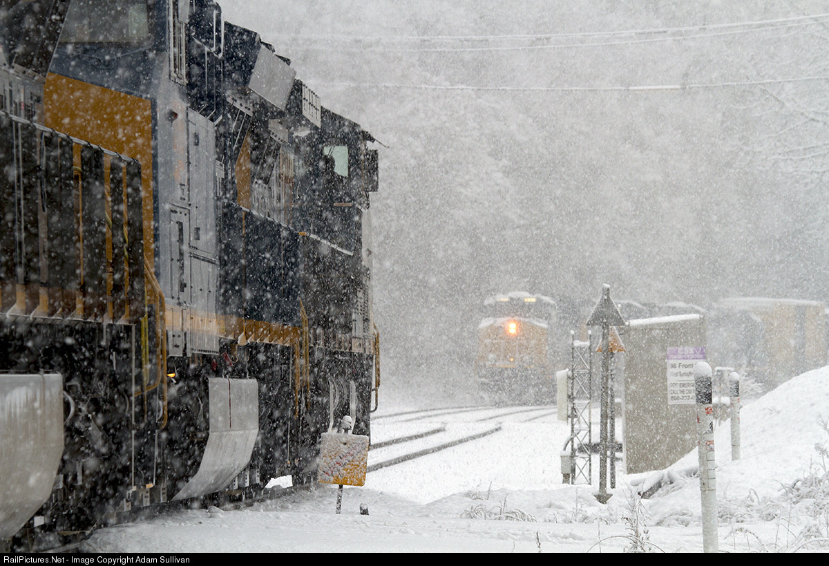 Q022-04 meets Q425-05 at West Springfield during an early February snow storm.