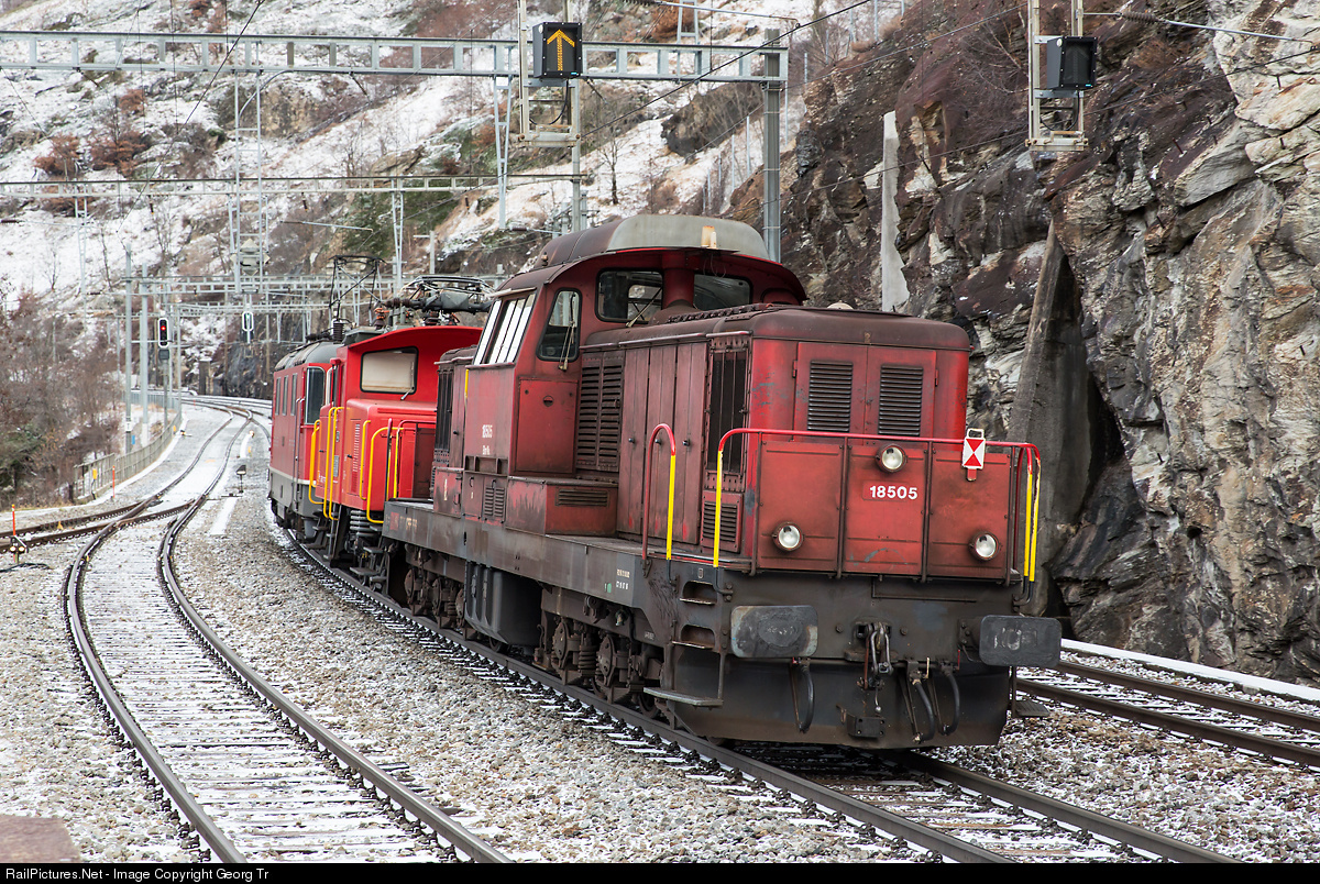 | Heavy diesel shunter Bm 6/6 # 18505 was the last of the series still in service for the SBB passenger division in Brig till now. On this day, the locomotive was pulled by Re 4/4 II # 11141, together with Ee 3/3 # 16440, over the Lötscherg mountain line to Olten. Probably it will be preserved by SBB Historic in the future. |