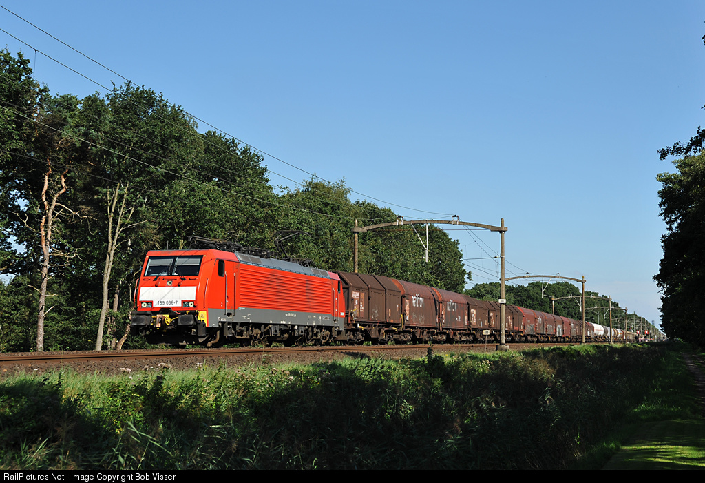 | DB Schenker 189 036-7 with a mixed freight near Tilburg. The yellow thing at the front is an automatic coupler for hauling iron-oretrains from Rotterdam Maasvlakte to Dillingen (and back empty), but this photo proves that hauling trains with traditional screwcouplers is also possible. |