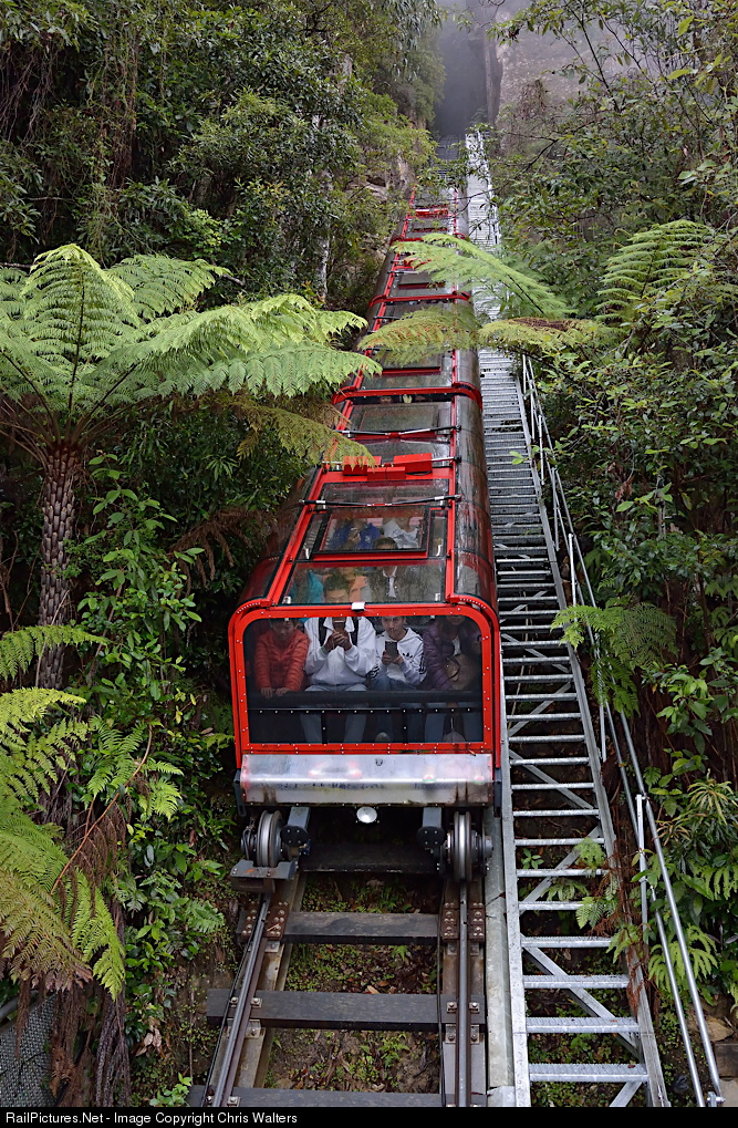 Scenic World's four-car train approaches the bottom station on the Scenic Railway at Katoomba, NSW, Australia. This incline funicular is described as both the steepest passenger railway and funicular in the world, dropping 250 metres (820 feet) over a distance of 310 metres (1,017 feet) - with a grade that tops out at 52 degrees as the line cuts through the cliff wall near Orphan Rock. Built during the 1880s, originally to serve shale oil mining interests in the Jamison Valley, the incline gradually attracted more and more (unofficial) tourist visitors until its use eventually shifted from mineral haulage to exclusive tourist service in 1945. The incline was completely overhauled and upgraded during January-April 2013, during which time the current Swiss-built train was commissioned. The new "Mountain Devil Mark V" train consists of 4 carriages - named (in order) Harry, Mary, Philip and Peta. They are named for 1st and 2nd generation members of the Hammon family, owner/operators of the Scenic World park that the funicular is now part of.