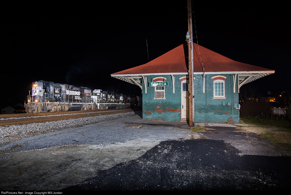 | Southern anybody? In a scene that is almost entirely southern, we see NS train p67 diverging onto the old Southern Railway Z-Line with an ex Southern highhood GP38-2 leading past the old Southern Railway Depot in Seneca, SC. |