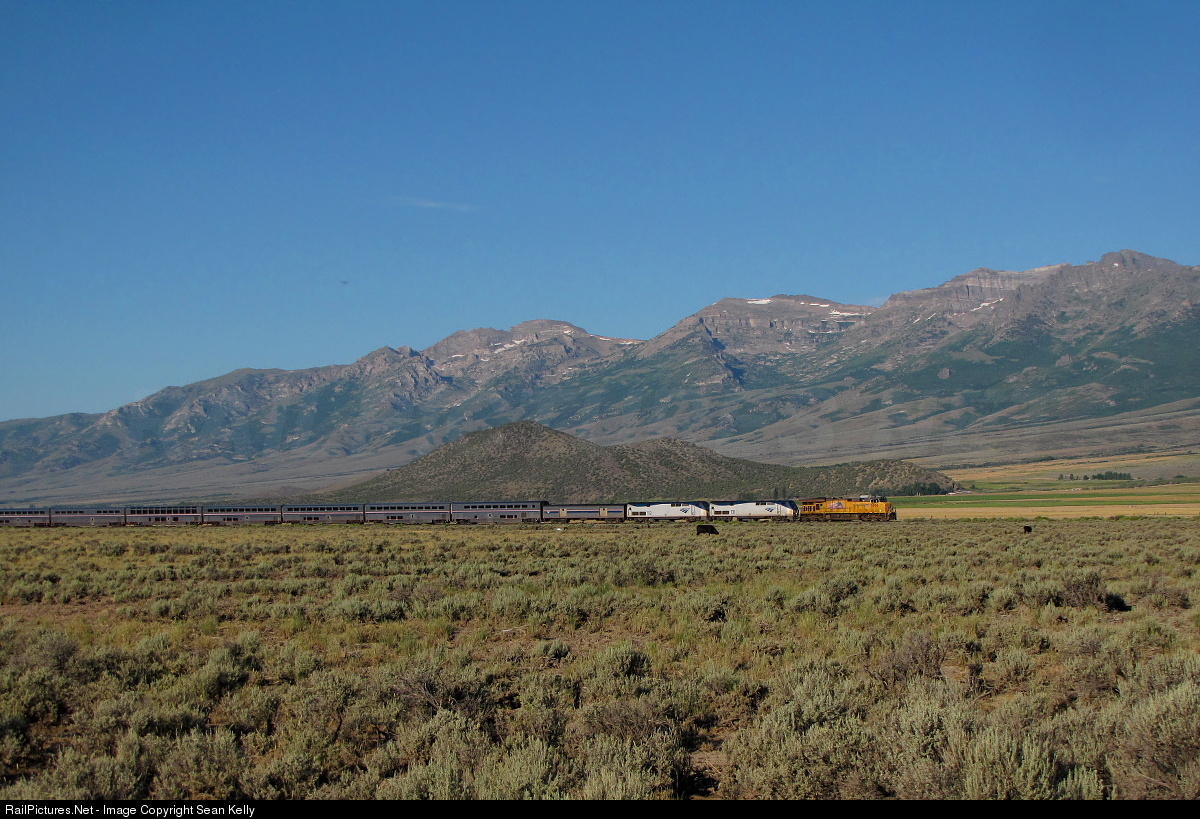 | In a scene normally traversed at night and with mountains reminiscent of Glacier Park hundreds of miles to the north, a late-running California Zephyr is seen racing across the high desert on a peaceful summer morning between Ruby and Wells on the old Western Pacific mainline. The impressive peaks to the west are the Ruby Mountains. |
