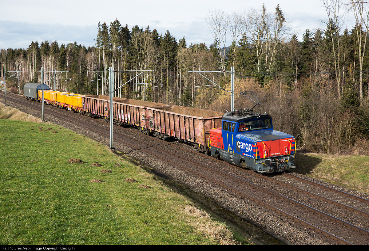 Dual system (electric and small diesel) locomotive Eem 923 # 011 (one of only 4 of the series 001-030 which has no name) is pulling freighttrain 58525 from Schwarzenbach to Burgau Deponie ZAB (BUDZ, siding between Flawil and Gossau).