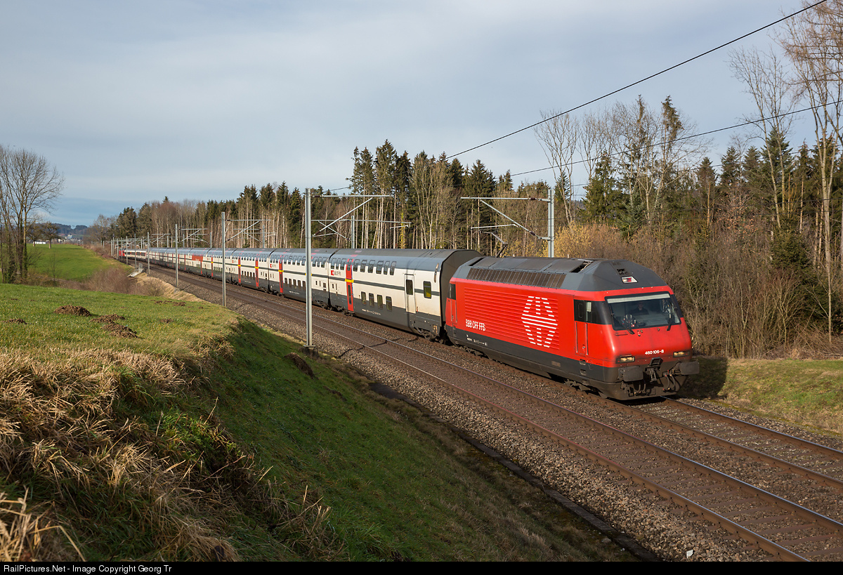 | Intercity 709 Geneva Airport-St.Gallen with 10 "IC2000" double deck cars and 4 standard cars type IV, with Re 460 # 106 in front and Re 460 # 003 in the rear, near Algetshausen. |