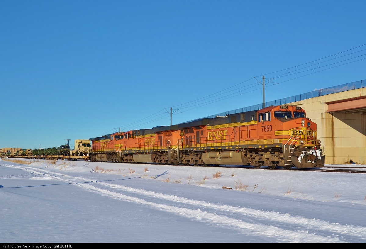 | BNSF 7650 (ES44DC) leads a train loaded with military vehicles south on the Joint Line, presumably to Fort Carson. |