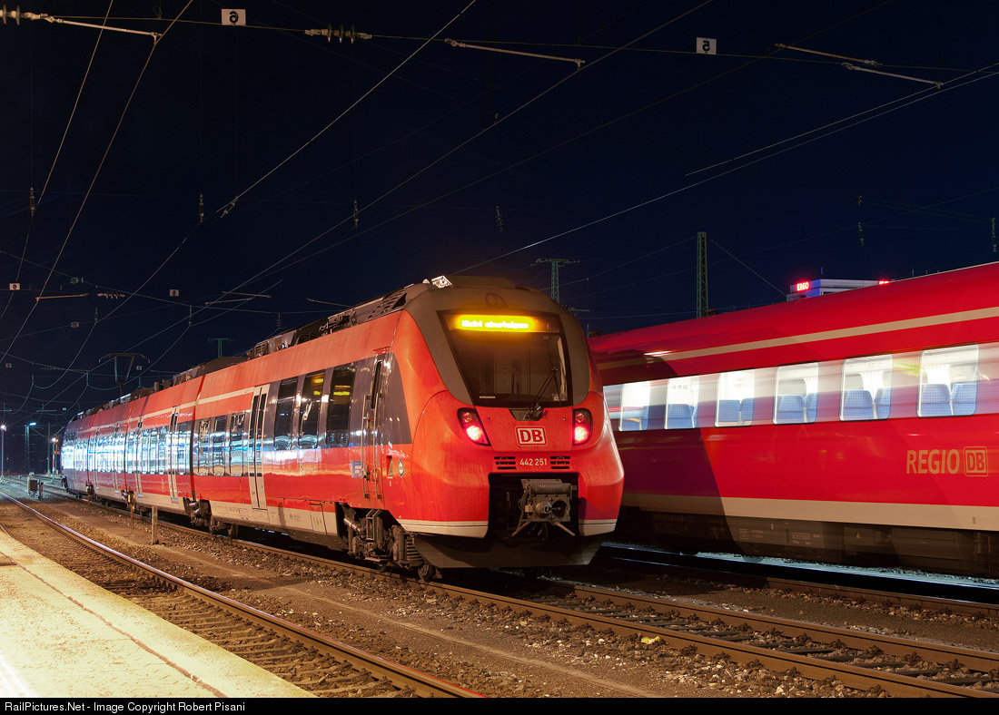 Evening at the busy main railway station in Nürnberg...a DB Regio consist passes an idle Bombardier Talent 2 EMU set assigned to Nürnberg S-Bahn service. |