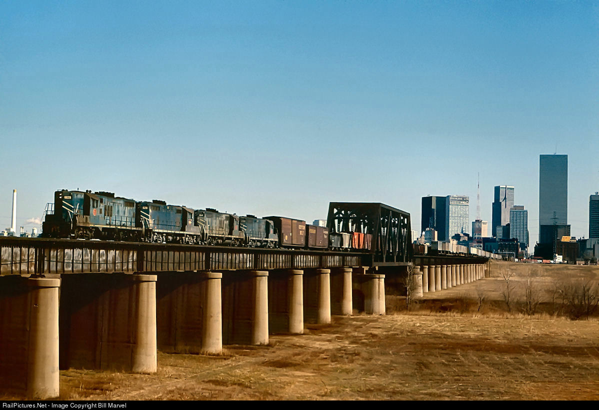 At a time when more prosperous roads are side-lining first-generation diesels in favor of more modern power, a foursome of aging Missouri Pacific geeps led by GP9 1809 crosses the Trinity River Bridge in Dallas with westbound freight NFY, 127 cars headed for Fort Worth. It’s high noon on the second day of 1978, the temperature is mild, the sky brilliant. Dallas’ skyline is just beginning to catch up with the city’s world-class ambitions. In a few decades this scene will be utterly transformed.
