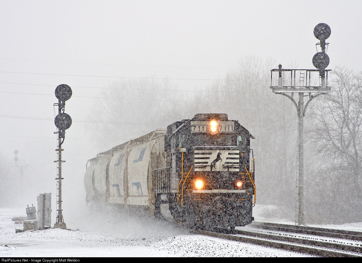 | Local train NS B43 rolls by NYC signals during a heavy snowfall in downtown Kendallville, IN. New signals are up here with all the old NYC signals to be cut over to new sometime in the near future all along this line. |