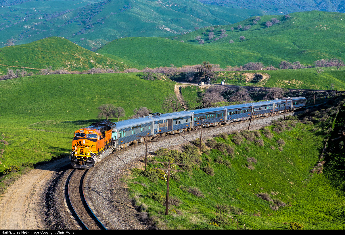 | A BNSF Officers Special with Tier 4 No.3920 on the point, climbs the western slope of the Tehachapi Mountains as it travels from Oakland CA. to Long Beach Ca. |