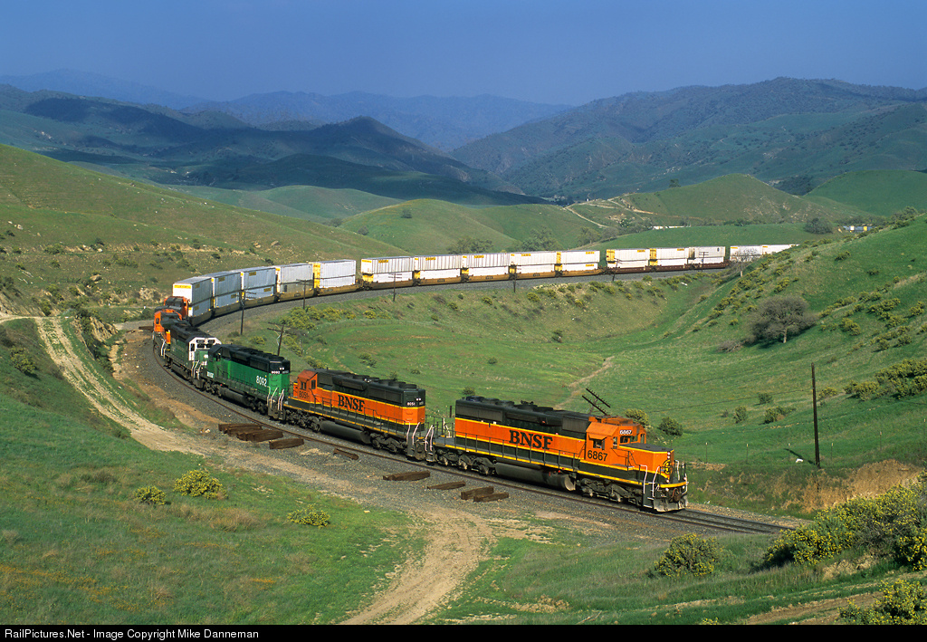 With the Tehachapi Mountains nicely greened up by winter rains, a Burlington Northern Santa Fe stack train grinds upgrade toward Bealville, California, on March 28, 2001. Former Santa Fe EMD SD40-2 “snoot” No. 6867 leads the eclectic group of motive power on the eastbound train.