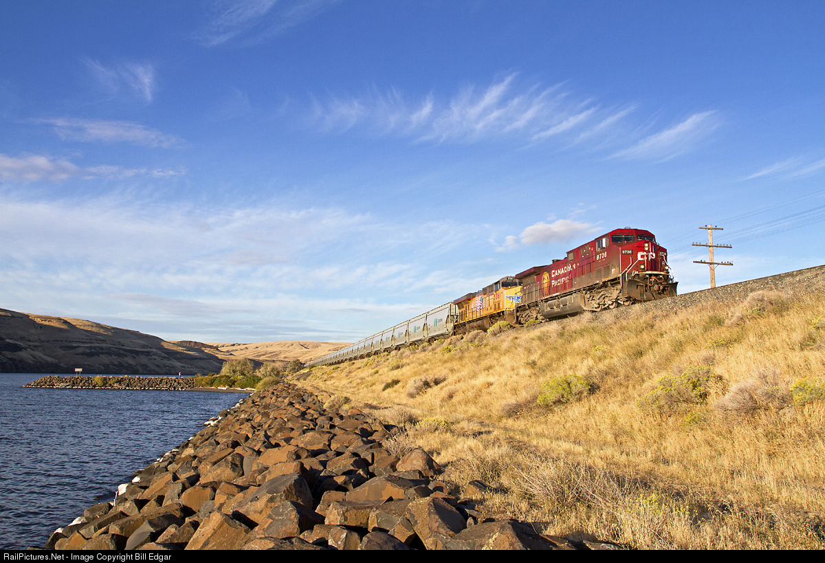 | Late afternoon sunlight washes over a southbound Canpotex potash train led by CP 9736 as it leaves Ayer, WA after meeting a BNSF freight at the small yard. The train is traveling on Union Pacific's mainline from Spokane to Hinkle, OR. It is a run-through from CP at Kingsgate, BC interchange to the former Spokane International (UP). Ayer is along the Snake River. |