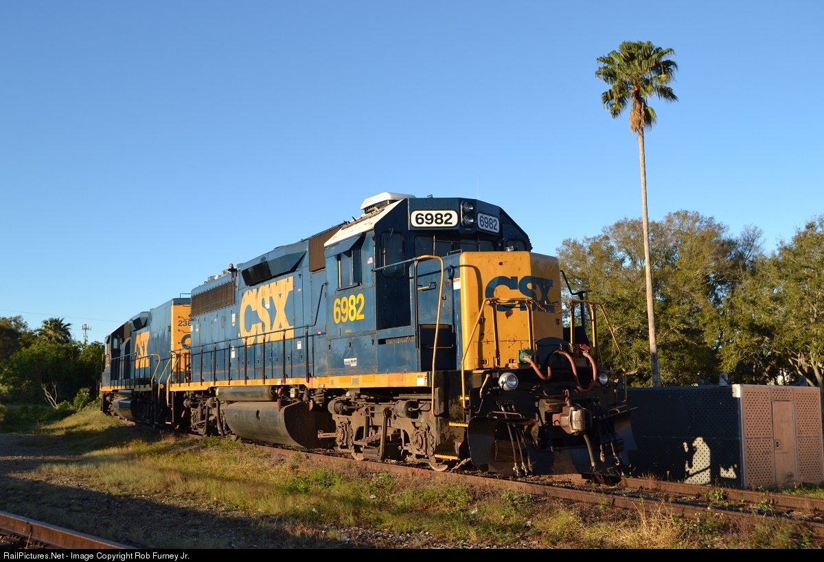 An old Reading Company GP40-2, now working for CSX, rests on a cool, late Winter morning, with an old B&O GP40-2 converted to a road slug. The engines are resting on what used to be the former SAL main line to St. Petersburg, FL, and the nose of the slug is resting just short of the former crossing with the ACL.