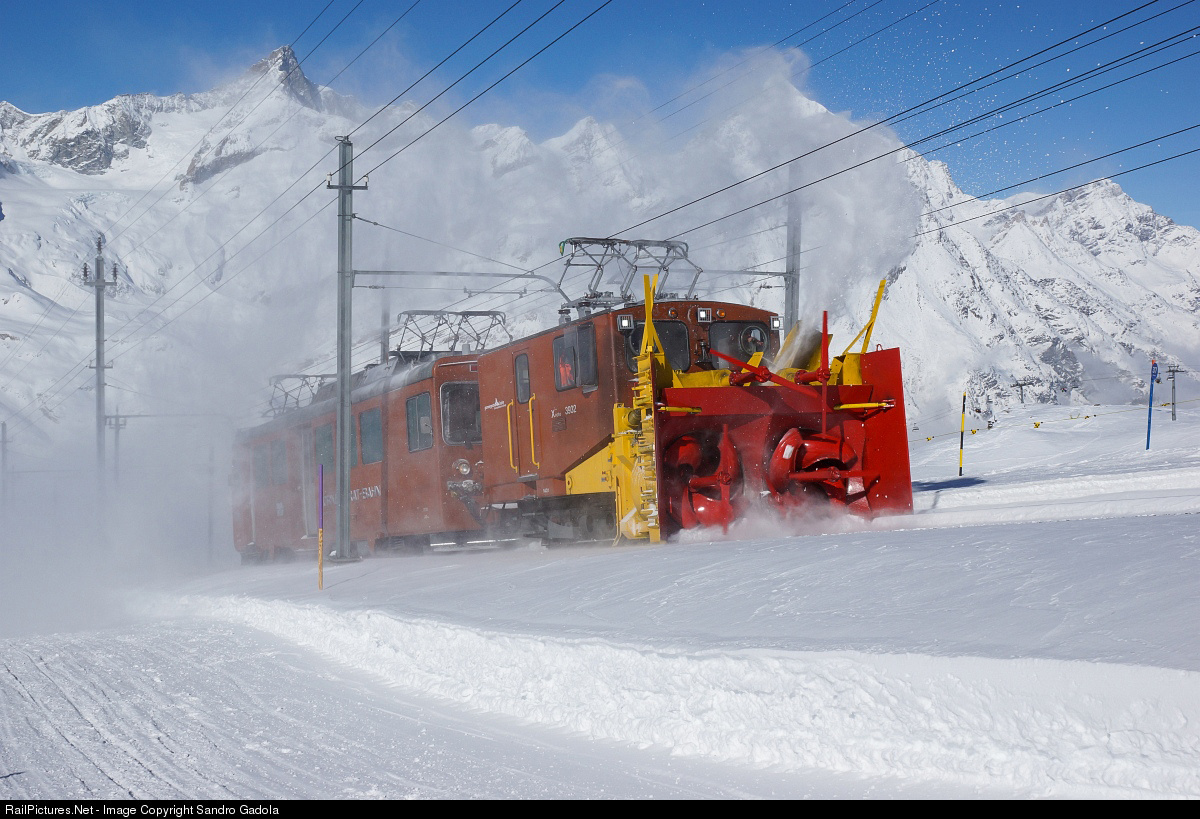 Snowblower Xrote # 3932 and cogwheel railcar Bhe 4/4 # 3061 below Rotenboden.