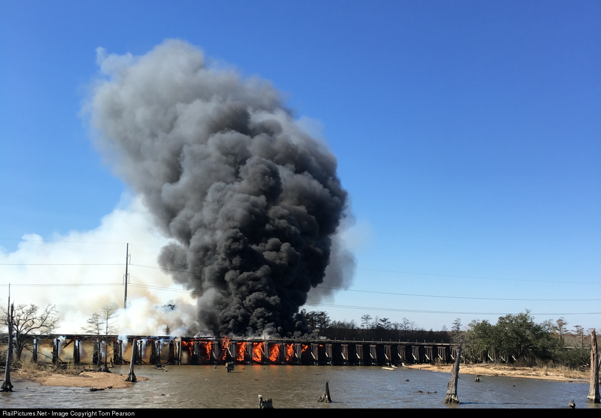 On Saturday morning 13 February 2016, a work crew was grinding rails, when sparks ignited the trestle. Attempts were made to extinguish the fire, but clearly that was unsuccessful. To the best of my knowledge, no one was injured. This is also the right of way that The City of New Orleans uses, thus passengers are being bused between New Orleans and Jackson, MS. Because of the location of the trestle/fire, 11 boats and 2 helicopters were used to fight the fire. Photo taken and used with permission by Gisele Knox. Interestingly...my wife, daughter and I had reservations to ride The City of New Orleans tomorrow from Jackson to New Orleans...looks like will be driving now instead!