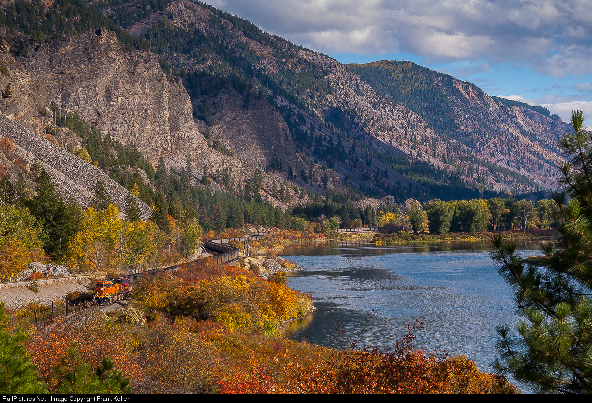 | A loaded coal train winds along the shores of the very scenic Clark Fork River amid the fall colors of a mid October day. At the time this photo was taken the property the photographer was standing was for sale. It would be a great location for a vacation home. In the distance a signal can be seen, during my first visit to the MRL in 1988 this was still a semaphore. |