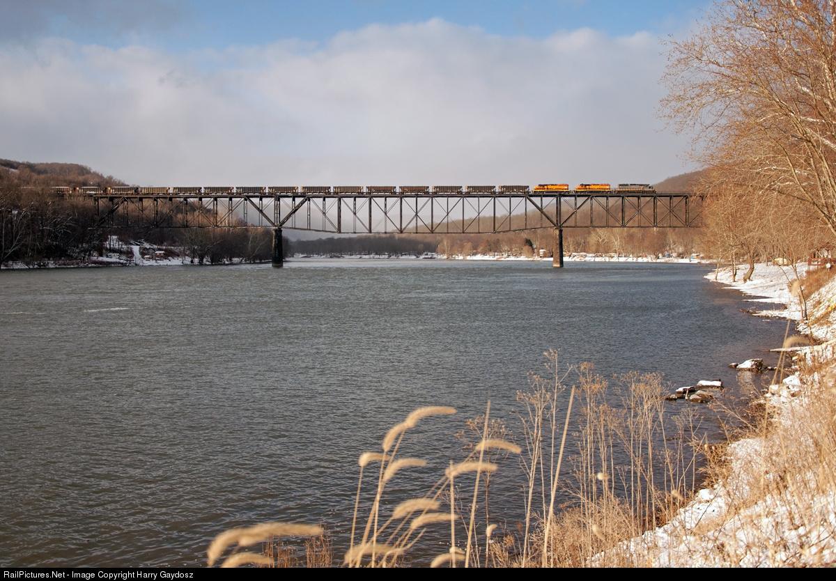 Three Canadian rebuilt SD40s are right at home pull coal loads across the icy Allegheny River on a blustery February afternoon.
