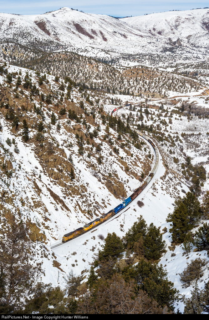 | Approaching a short tunnel, Union Pacific locomotive 8261 leads a westbound manifest freight train near Radium, CO on February 13, 2016. |