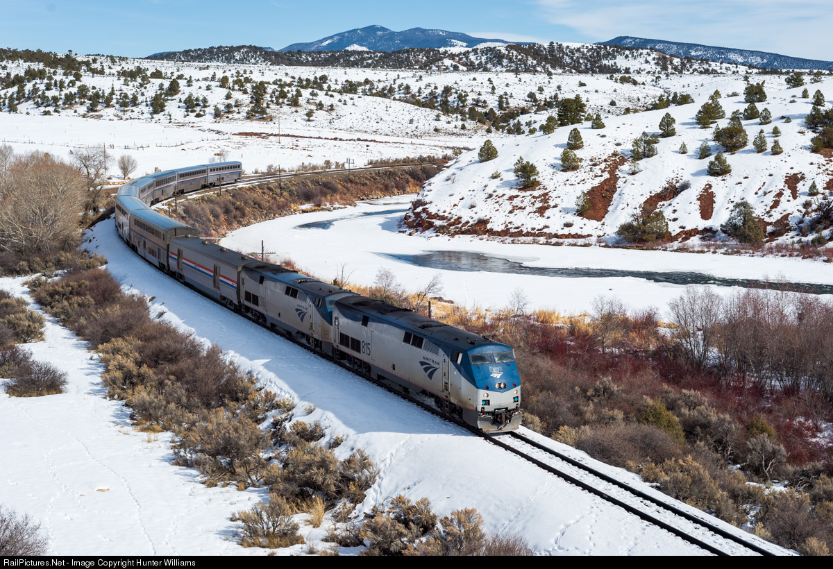 | Running on time, the westbound California Zephyr rolls along next to the Colorado River just east of Burns, CO on February 13, 2016. |