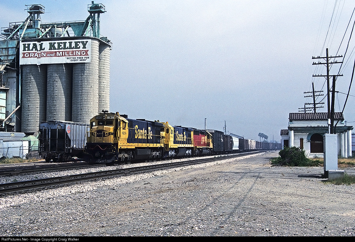 Colton, Not West Colton. Rolling past the Colton station and approaching the famed Colton Crossing (where the Southern Pacific crosses the Santa Fe / Union Pacific) is a westbound Santa Fe train. Led by C30-7s 8138 and 8102, along with an SD45-2, on Cinco de Mayo 1989.