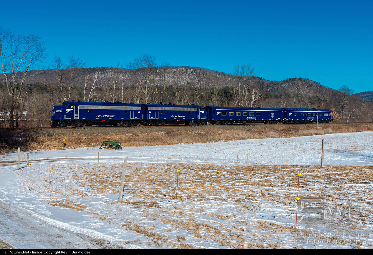 Pan Am Railways FP9As PAR-1 and -2 head westbound through Buckland, MA during a 0-degree F rare winter run of the Pan Am Railway office car special train on Sunday, February 14, 2016. The train was moved from East Deerfield, Massachusetts to Mechanicville, New York for a planned occupied eastbound run on February 15.