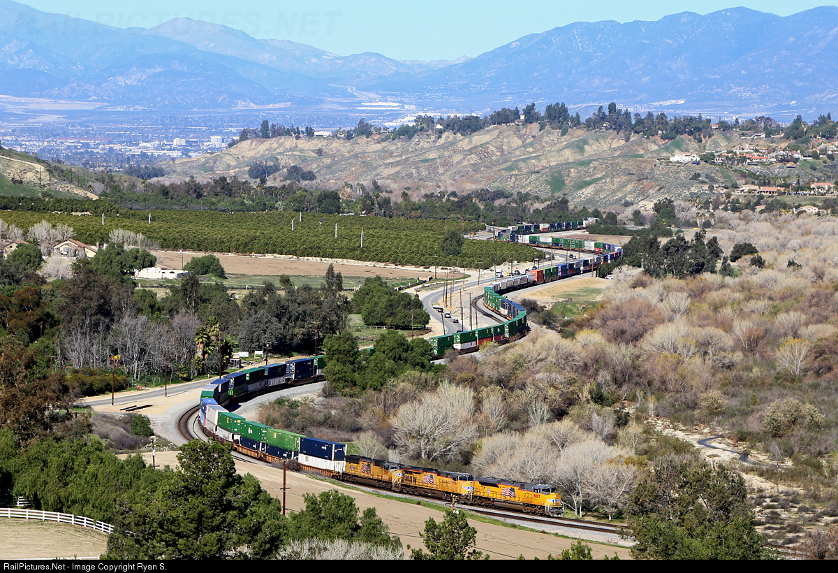 Leaving the urban backdrop of southern California behind, UP's hotshot ZLAMQ slithers up the western slope of Beaumont Hill, commonly referred to as San Timoteo Canyon. In the distance one of many citrus fields that still line the former SP Sunset Route in the confines of San Timoteo provides a welcome reminder to southern California's rich citrus history and the involvement of the railroads to haul it to markets in the east.