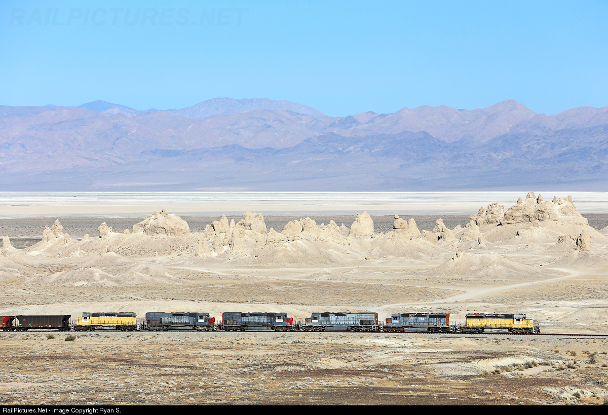 Six graduates of Electro-motive's La Grande, IL erecting hall, class of the SD40 series, bring the westbound empty Trona 'coal buckets' out of the Searles Valley and towards an interchange with the Union Pacific in Searles, CA. Rising above the dry lake bed beyond the power are the Trona Pinnacles rock formations.