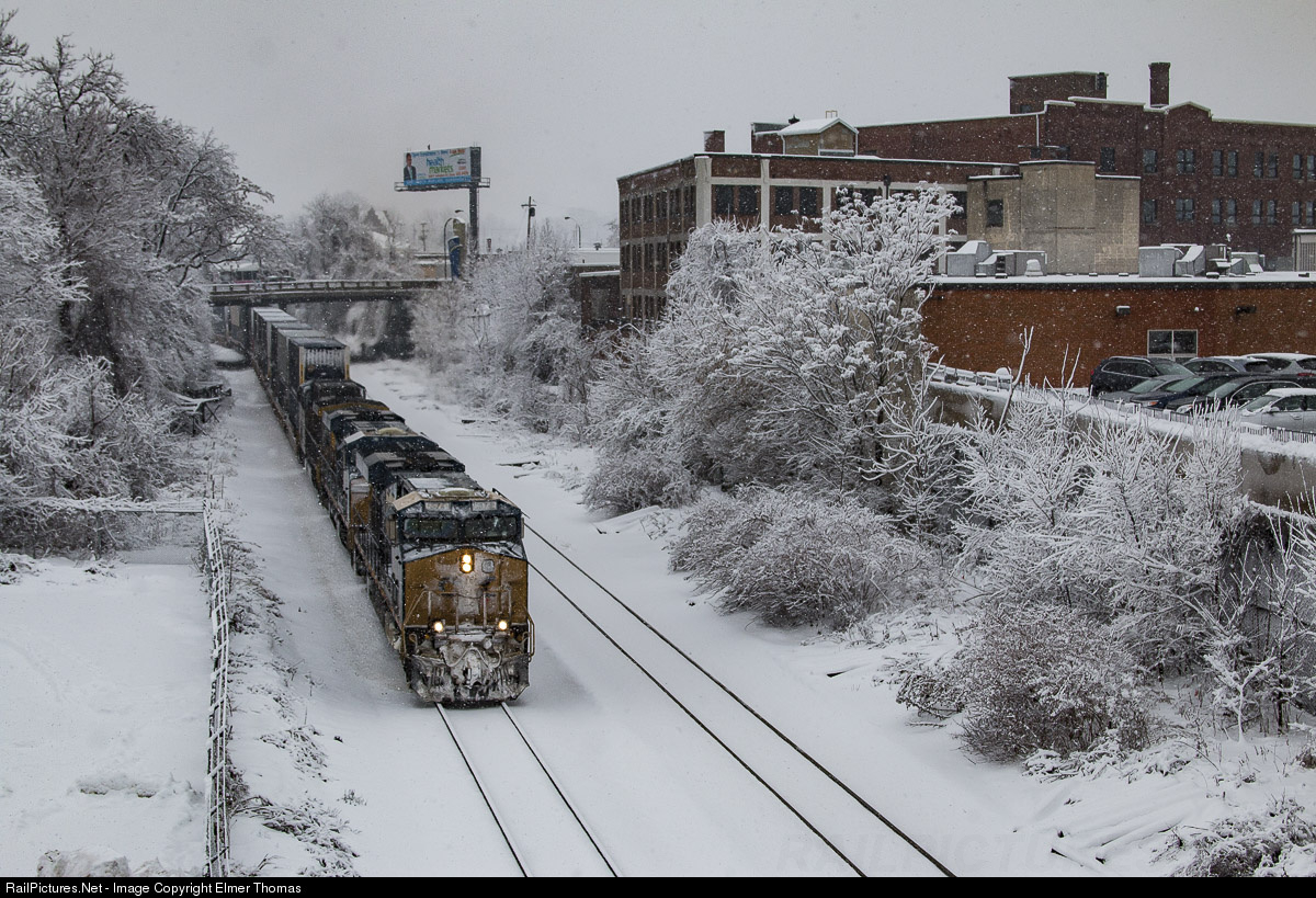 CSX Locomotive number 874 leads train ID Q015 through a late morning snow shower in Akron Ohio