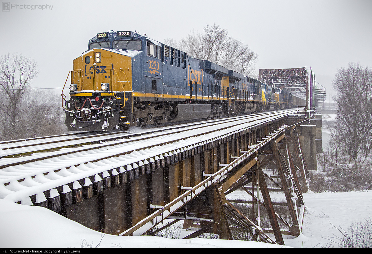 | While most people in the tri-state were nice and cozy in their warm homes...A couple of friends and I decided to go out in the middle of the storm and get some pictures. Attached below, CSXT 3230 along with four other units tug on a covered hopper train across the Big Sandy Bridge in Kenova, WV. |