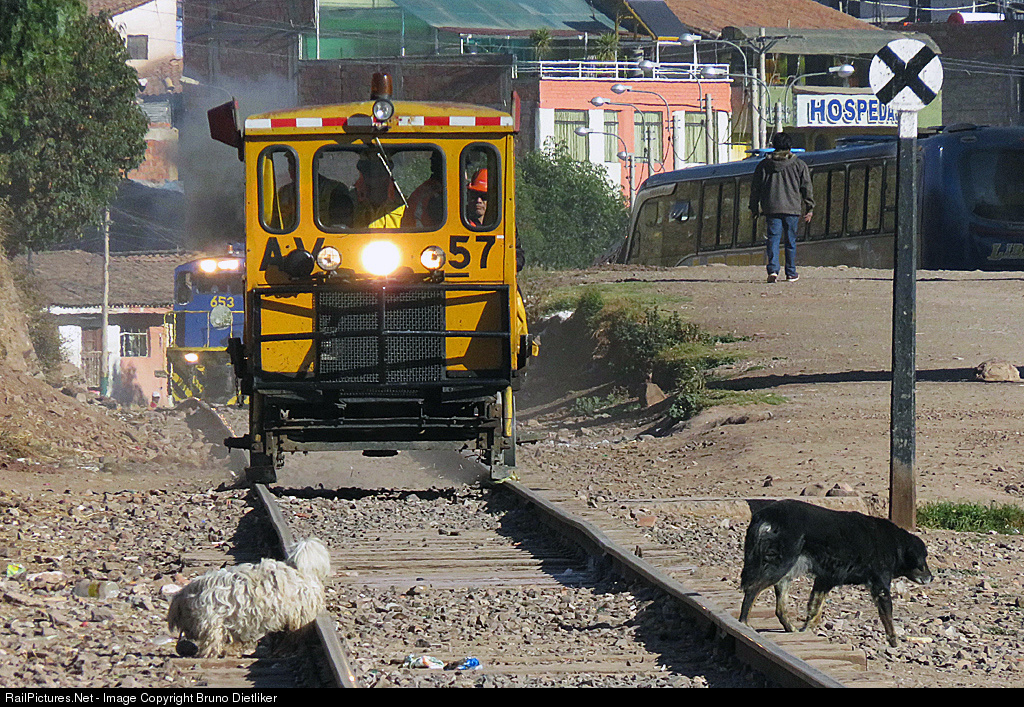 | These dogs don't interested in this vehicle. The track motor car runs a few seconds in front of the Andean Explorer (Cusco - Puno) in the background |