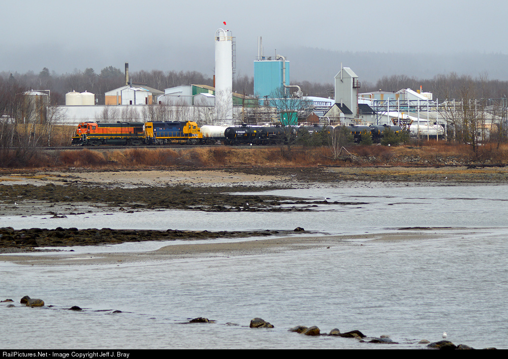 Having finally left the day's heavier rain behind, Central Maine & Quebec's #211 was nearing it's final destination of Searsport, Maine on February 20, 2016. Looking across the bay from Sears Island Road, B23-7 2003 and a GP35 crawled past the GAC complex at Kidder's. The crew would pick up two tracks of sulfuric acid empties to the right of the power before eventually reaching Searsport Yard two miles to the West. Low clouds were still holding on to the hill tops in the distance.