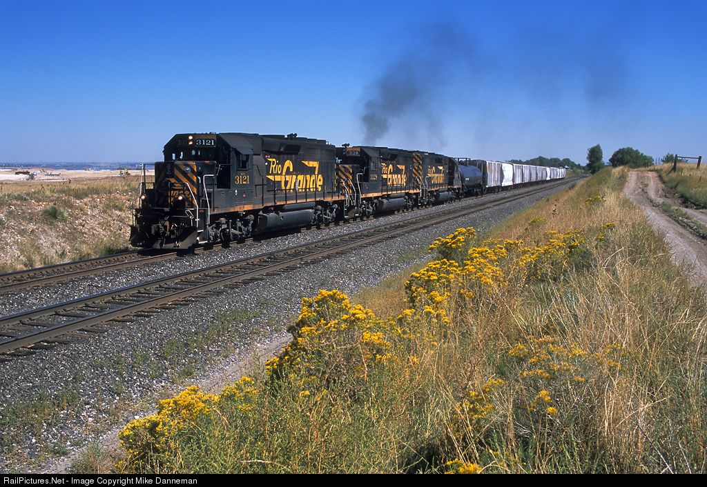 Union Pacific’s West Local departs Leyden, Colorado, on September 20, 2001. Powering the local is three Rio Grande EMD GP40-2s, Nos. 3121, 3128 and 3100—and they have a tank car for Chem Spur, and 14 covered hoppers for the aggregates plant at the end of Rocky Spur.