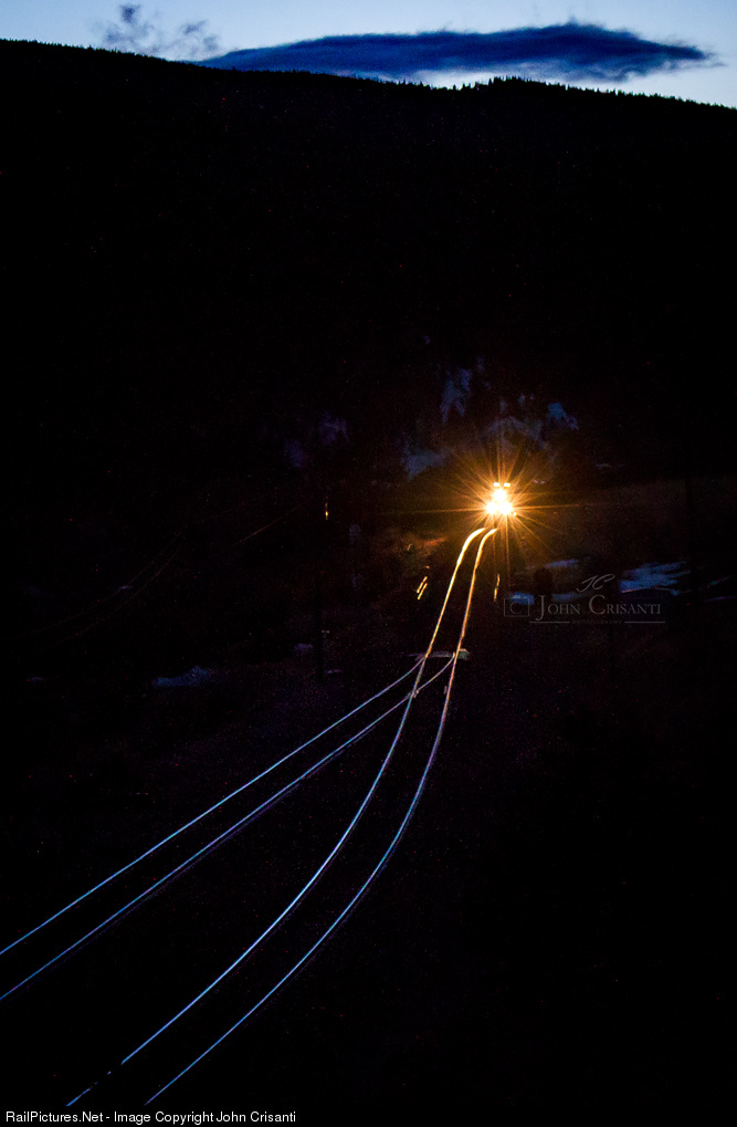 | Dusk has arrived in the high country as eastbound coal loads from Energy Mine roll down the 2-percent grade approaching the west end of Rollinsville, Colorado on February 21, 2016. |