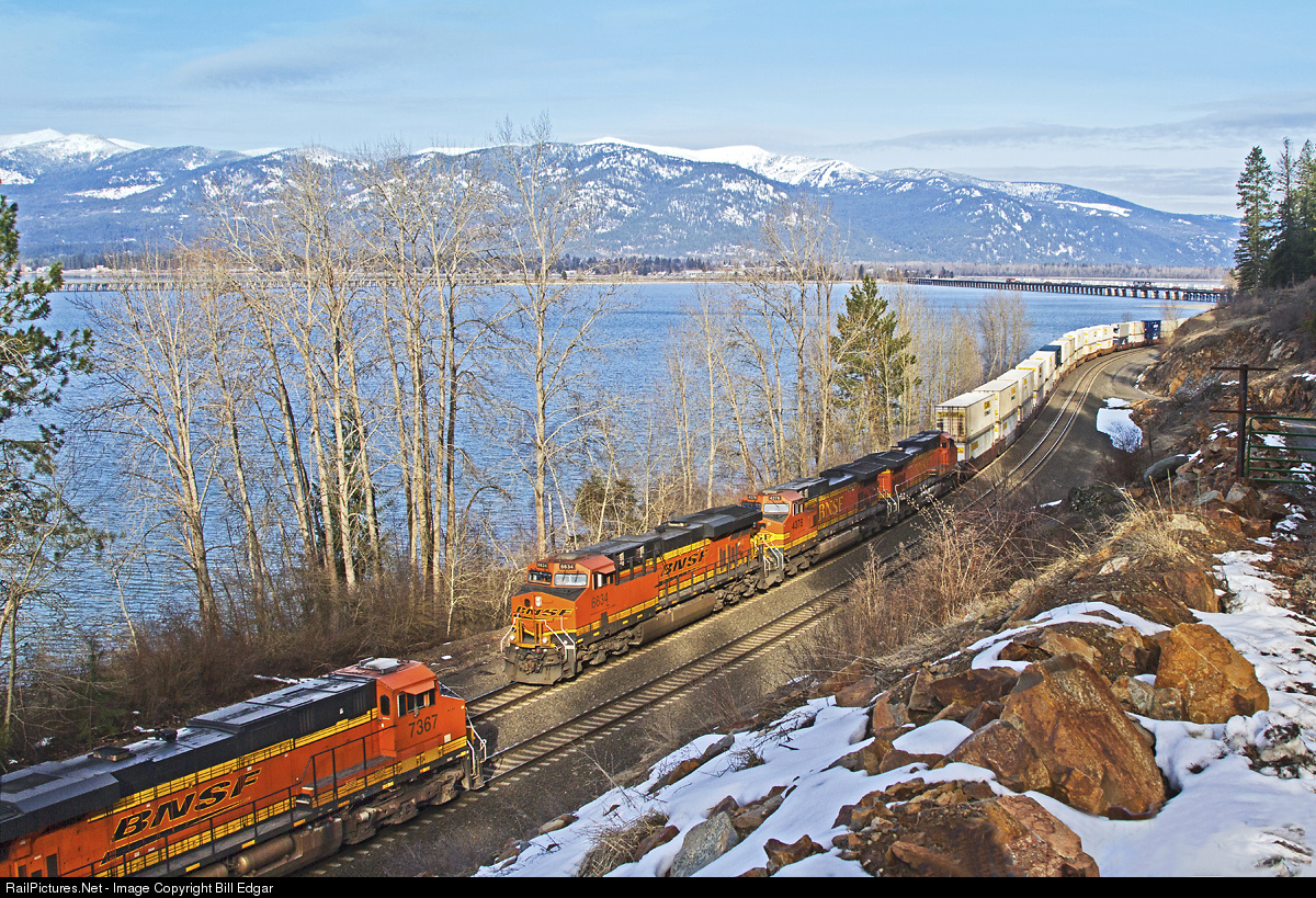| BNSF 6634 guides a westbound Z train past a slowing manifest behind BNSF 7367. The Z's DPU is about midpoint on the Lake Pend Oreille bridge at Sand Point, and the manifest will have to make a brief stop while the train clears. Valley snow is already melting off, but Schweitzer Basin above Sand Point still has plenty of snow for skiers. |