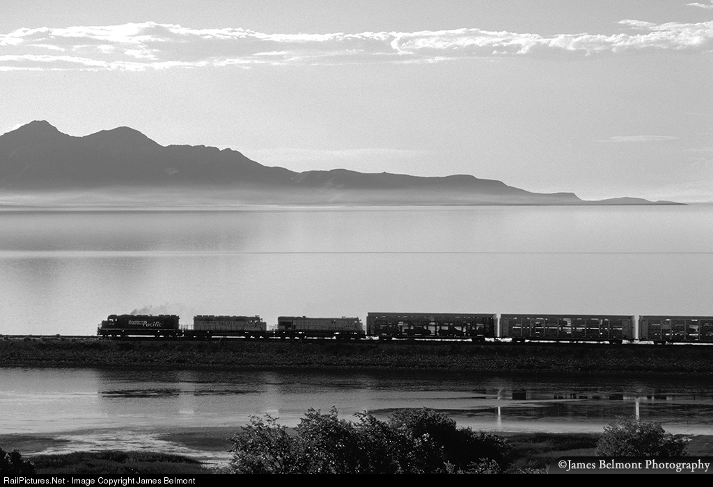 | A UP Herrington, Kansas to Oakland, California auto train crosses the Great Salt Lake along the former Western Pacific Railroad on July 31, 1997. |