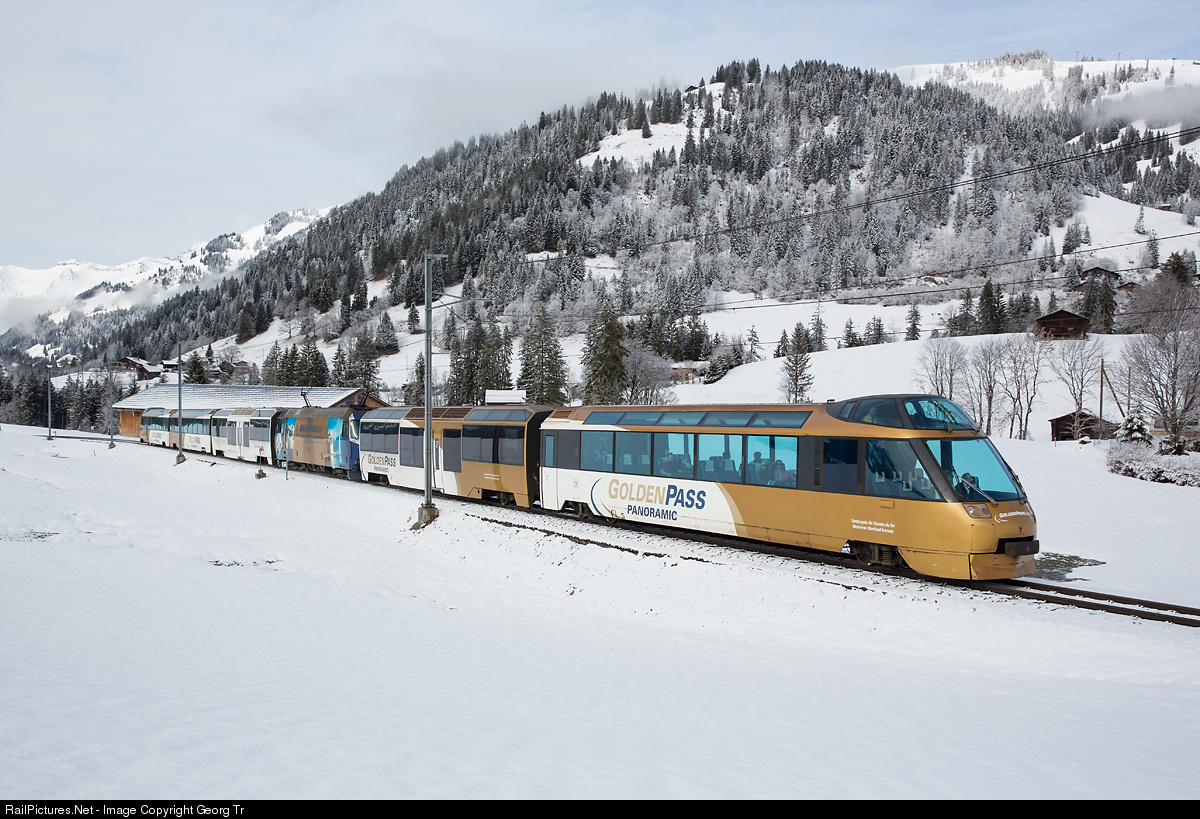 | Locomotive Ge 4/4 # 8002 (built by SLM and ABB in 1995) with the "Goldenpass Panoramic" train 3118 from Montreux to Zweisimmen between Gruben and Schönried, with leading cab car Ast # 151 and cab car Ast # 152 in the rear. The driver is sitting in the high-lying cab, the passengers can enjoy the view from the very front row. |