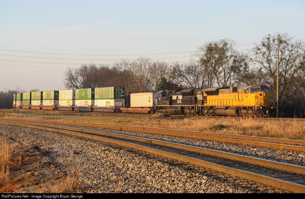 | Hotshot intermodal #282 is led by one of NS's SD90Mac's purchased from UP. Over half of these units are stored currently, and many have been rebuilt or sent for rebuilding into the SD70ACU program. So, catching one of these beasts roaming the NS system has become increasingly rare. |