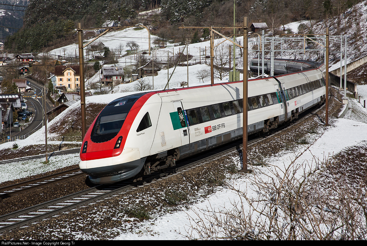 Tilting train RABDe 500 # 039 "Auguste Piccard" as ICN 667 from Basel via Lucerne to Lugano above Erstfeld.