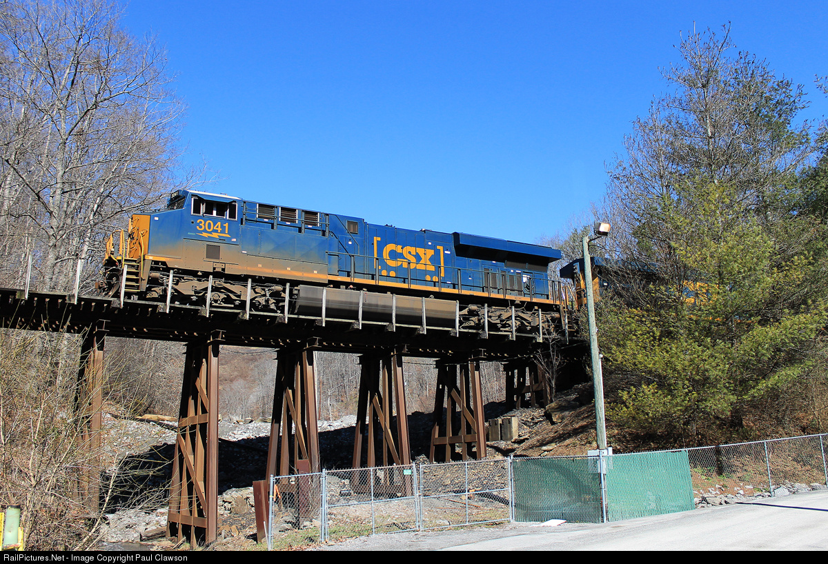 | CSXT 3041 comes to a stop on the very light duty trestle at Lone Mountain Processing with all the cars now just beyond the loadout, Delmer the engineer will now wait for the word from his conductor Bo to start easing forward at around 3 tenths of a mile per hour to start loading. |
