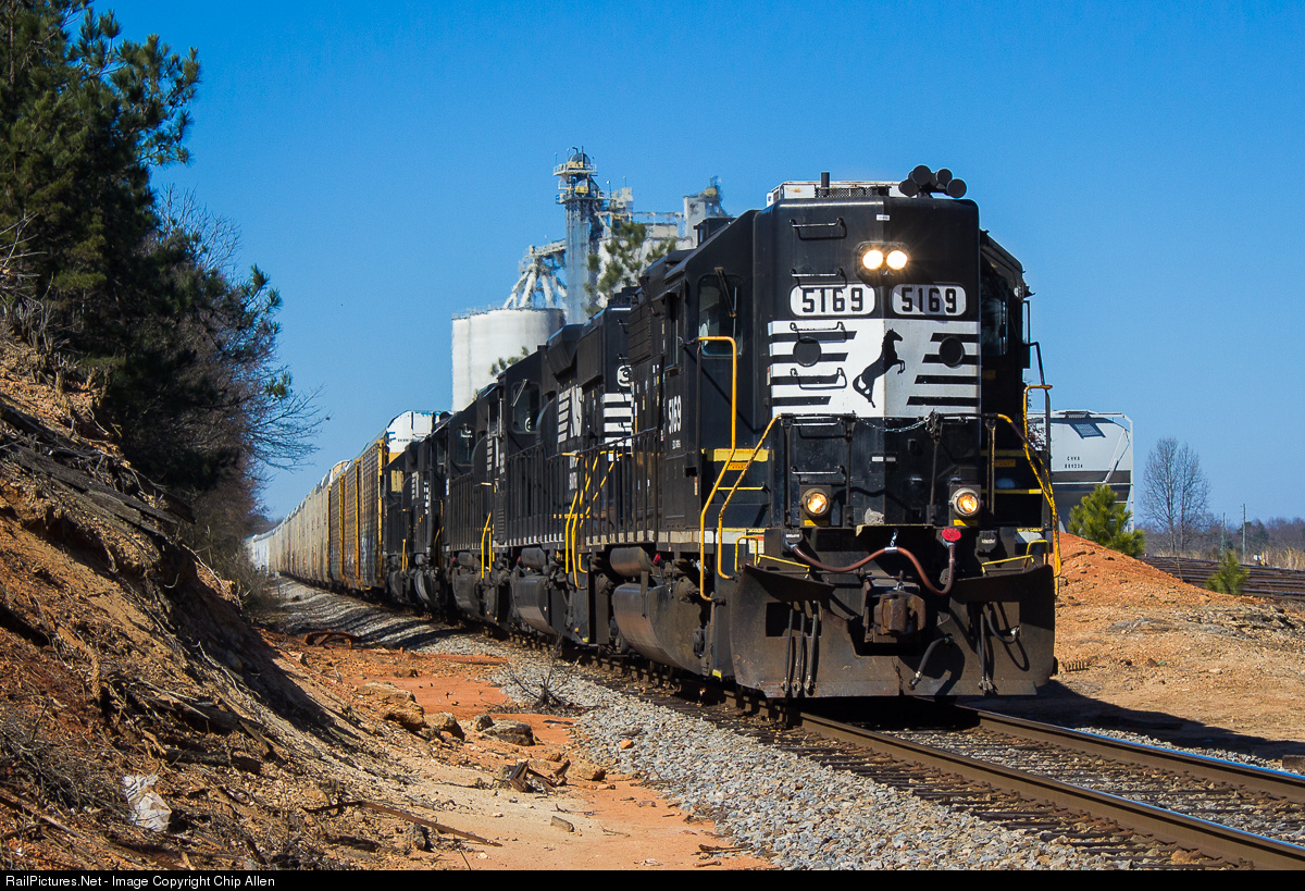 | An ex-Southern Geep leads NS P12 by the Mar-Jac Poultry feed mill in Maysville on the former Southern Commerce Branch. The lead unit and four SD40-2s are on the point of a train of Toyotas bound for the finishing plant in Commerce. It doesn't get much more classic for northeast Georgia than high hoods, red clay, chicken feed, and branchline railroading. |