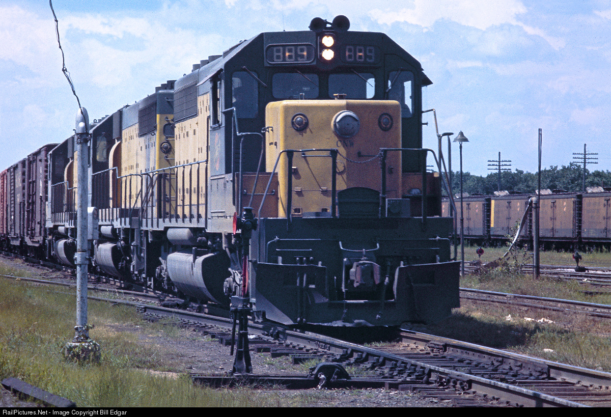 A CNW freight from Minneapolis arrives at Altoona, WI yard for a crew change and some switching. As it approaches the depot, it passes by a string of yellow and green ice bunker reefers stored for potato service in northwestern Wisconsin. The SD40s were some of the first CNW units equipped with the low-nose mounted gong bell that became a trademark of the railroad for the next 15 years or more.