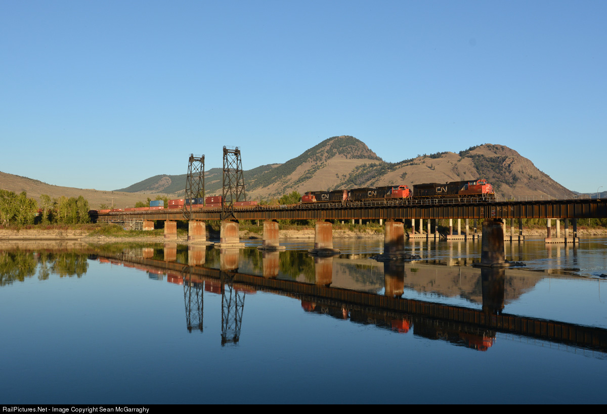 A CN freight departs Kamloops North crossing the North Thompson River late on a warm summers afternoon hauled by 8962, 8818 & 2150.