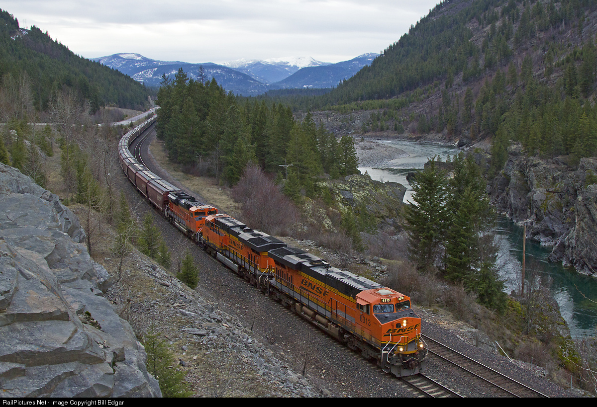 | A BNSF empty grain train rolls east at Kootenai Falls, MT along the Kootenai River. Spring-like temperatures have taken care of snow in the valleys in this area. The Kootenai valley is the lowest elevation in the state of Montana. |