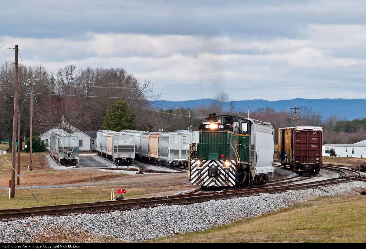| While some shortlines have withered away over the years, the Alexander seems to be adding new customers and new sidings every time I visit. This small yard near the line's northern terminus of Taylorsville was added a few years ago for sorting cars at the new transload facility. With the foothills in the background, switcher 11 shuffles cars before heading south of a days word. |