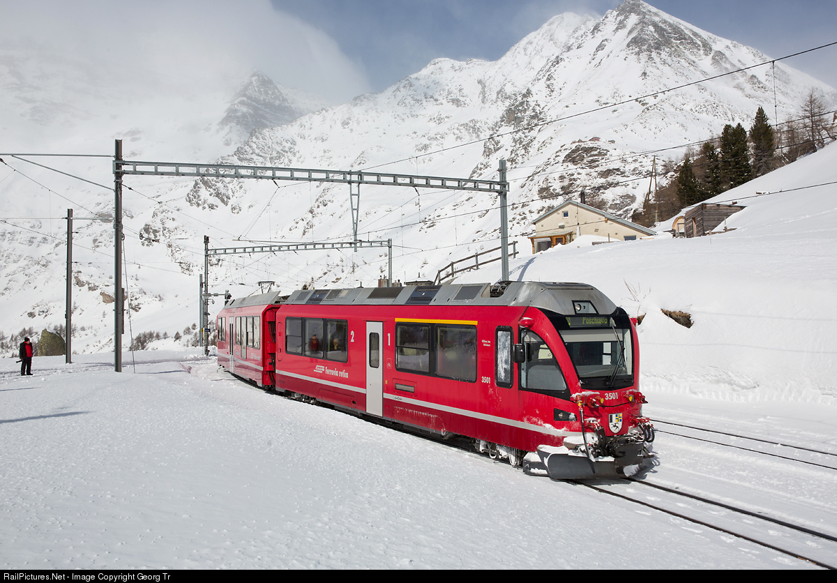 | "Allegra" ABe 8/12 # 3501 is leaving Alp Grüm with train 1621 to Poschiavo, running through the more then 180 degree panorama curve. |