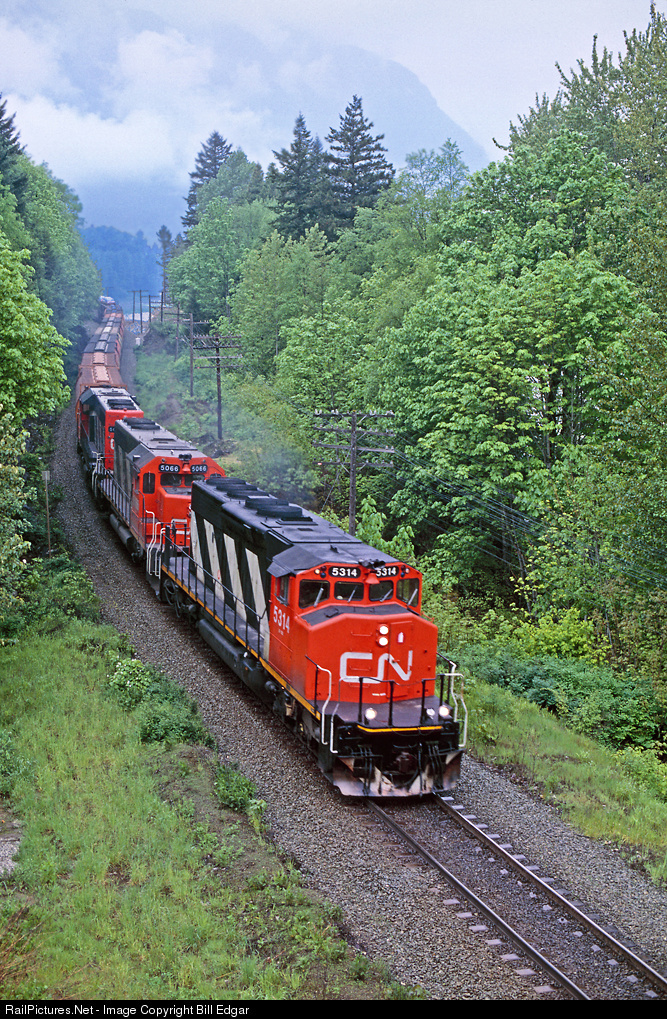 | CN 5314 leads a pair of standard SD40s on an eastbound freight headed east from Vancouver, BC to Kamloops. The train is just arriving at Hope, BC ducking under Trans-Canada Hwy 1. |